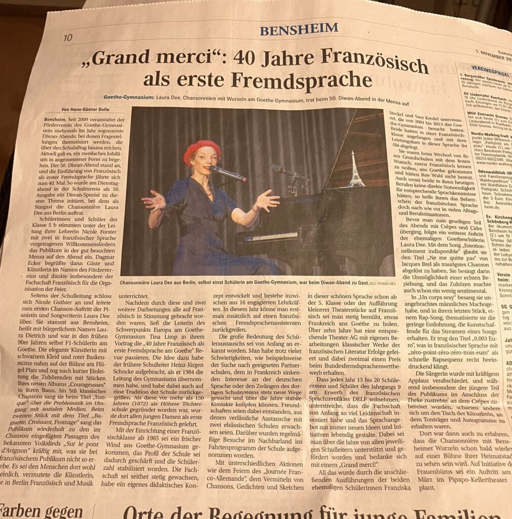 Meine musikalische Reise begann 2010 in Aachen mit meinen ersten Klavierliedern. Es folgte die von mir geleitete Livemusik-Talk-Reihe „Songwriter’s Table“ (vorher Danger Dan). Meine Präsenz in meiner Heimatstadt Bensheim/Bergstraße hält bis heute an. In Berlin habe ich mein 3. Album „Courageuses“ aufgenommen und bin u.a. im Scheinbar Varieté, dem Zimmer 16 und dem Zebrano-Theater aktiv. Im Oktober war ich auch in der Bar Jeder Vernunft und im TIPI AM KANZLERAMT zu Gast.